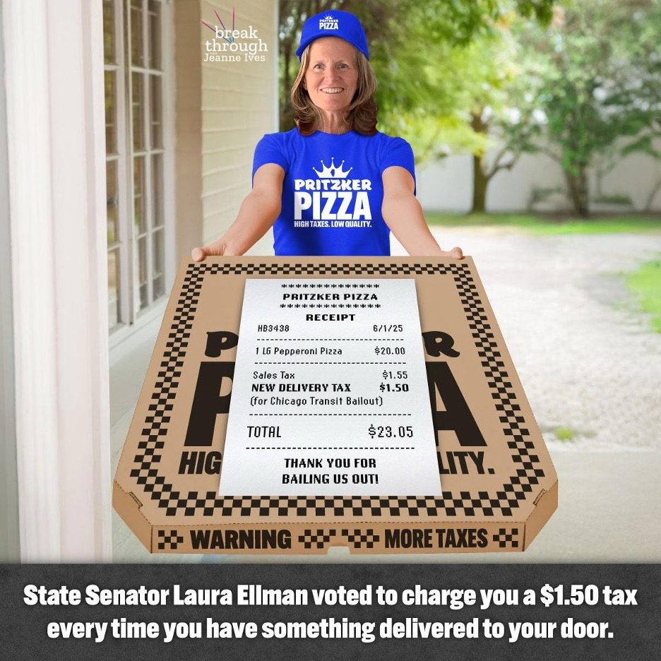 We think graphics and memes often tell the story far more effectively than pages of commentary. The graphic above is our most recent one, highlighting the vote of Naperville State Senator Laura Ellman (D), 21st District, for the $1.50 Delivery Tax in HB3438 that will be used to bail out Chicago-area transit agencies.