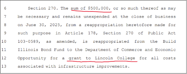 Fed Spending Cuts Expose Democrat Spending PrioritiesA story getting a lot of traction this week is the one I first saw from FOX Illinois about Lincoln College, which has been closed for two years, receiving a $500,000 allocation in the FY 2026 state budget. Social media posts on this are getting lots of shares and comments about how stupid Illinois legislators can be to grant money to a defunct entity. In response, at least one state senator assured the media that the money wasn’t actually transferred to the college,
