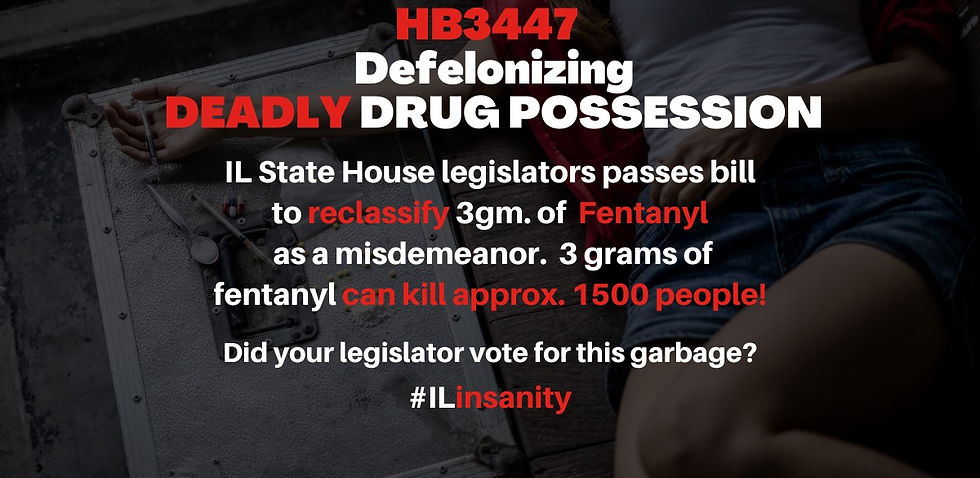 Fentanyl is produced in China and transported to the U.S. by Mexican drug cartels. No amount of Fentanyl is safe, yet HB3447 now classifies the possession of 3g of Fentanyl as a misdemeanor. That’s more than enough Fentanyl to kill approx. 1500 people!