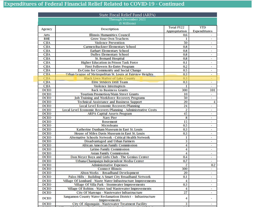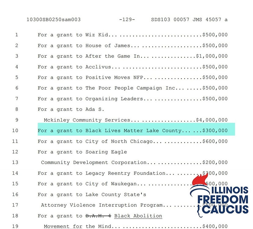 The most recent Illinois budget includes a $300,000 grant to Black Lives Matter Lake County. The group is led by a convicted felon and appears to be defunct.
