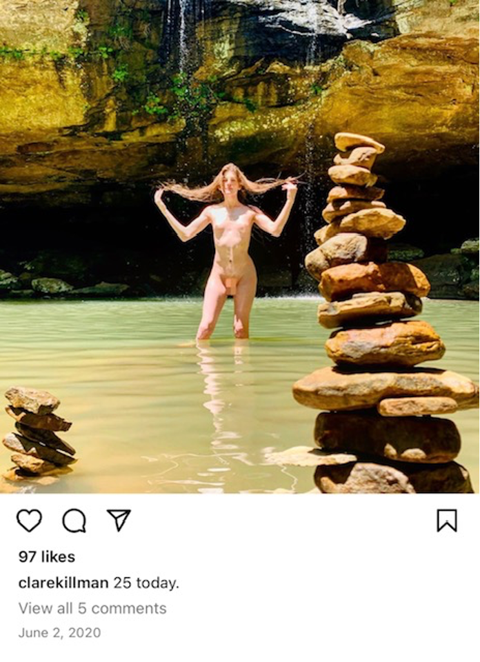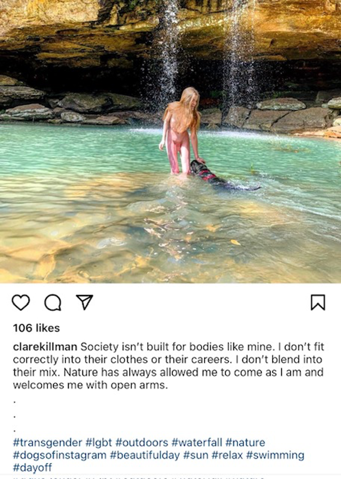 “Clare” has a particular fondness for posting photos of himself nude, exposing his buttocks and breasts while carefully concealing his homegrown junk, about which he says, “Society isn’t built for bodies like mine. I don’t fit correctly into their clothes. … I don’t blend into their mix. Nature has always allowed me to come as I am and welcomes me with open arms.”