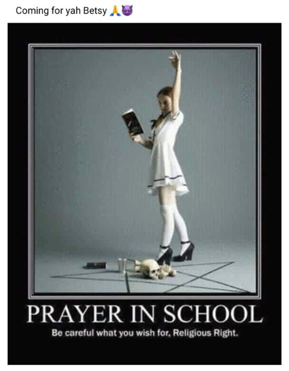 Martin is threatening Trump’s Education Secretary Betsy DeVos that he will bring Satanic prayer to public schools.