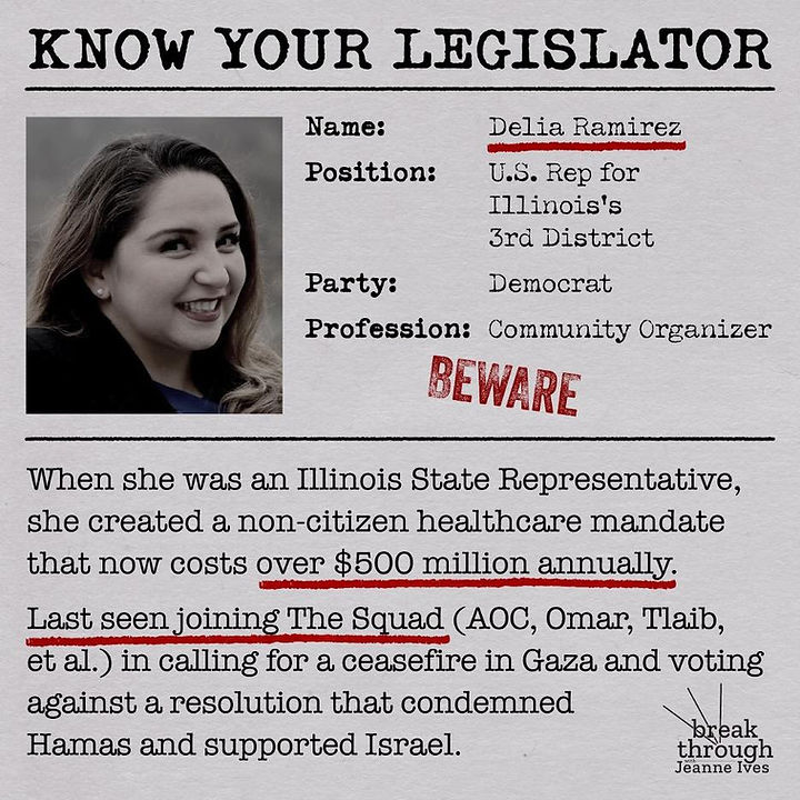 Ramirez is a disaster. Remember that taxpayer funding for non-citizen healthcare in Illinois was her initiative. Now she is in Congress supporting terrorists. She’s all in for illegal immigration with no restrictions. There’s not a radical Democrat policy she hasn’t endorsed – abortion up until birth, mutilation of children with transgender surgeries, student loan debt relief, and so much more.