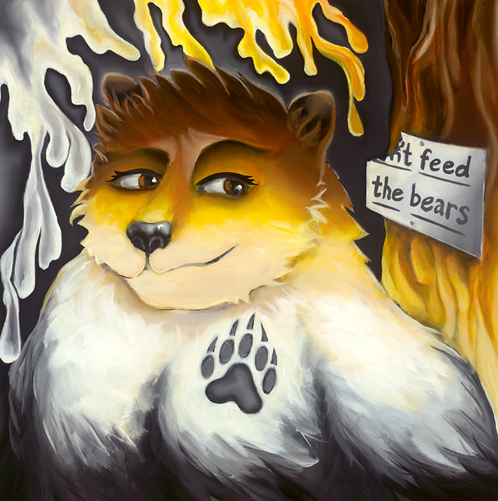 For those unfamiliar with “gay” culture, some men are erotically attracted to fat, hairy men who are called “bears.” The bear pawprint and the colors of this childish painting are derived from the bear pride flag.
