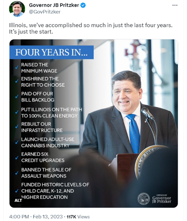 On Wednesday, Governor Pritzker gave his combined State of the State and Budget Address in front of members of both the House and Senate. Above is his Tweet with his accomplishments over the last 4 years.