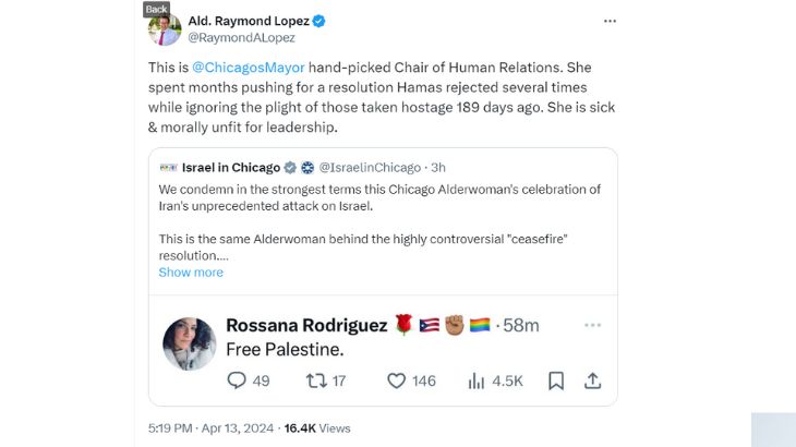 Shortly after the reports of the attack on Israel, Chicago Alderperson, Rossana Rodriguez posted “Free Palestine” on her X page. Alderman Ray Lopez responded as follows on his X account.