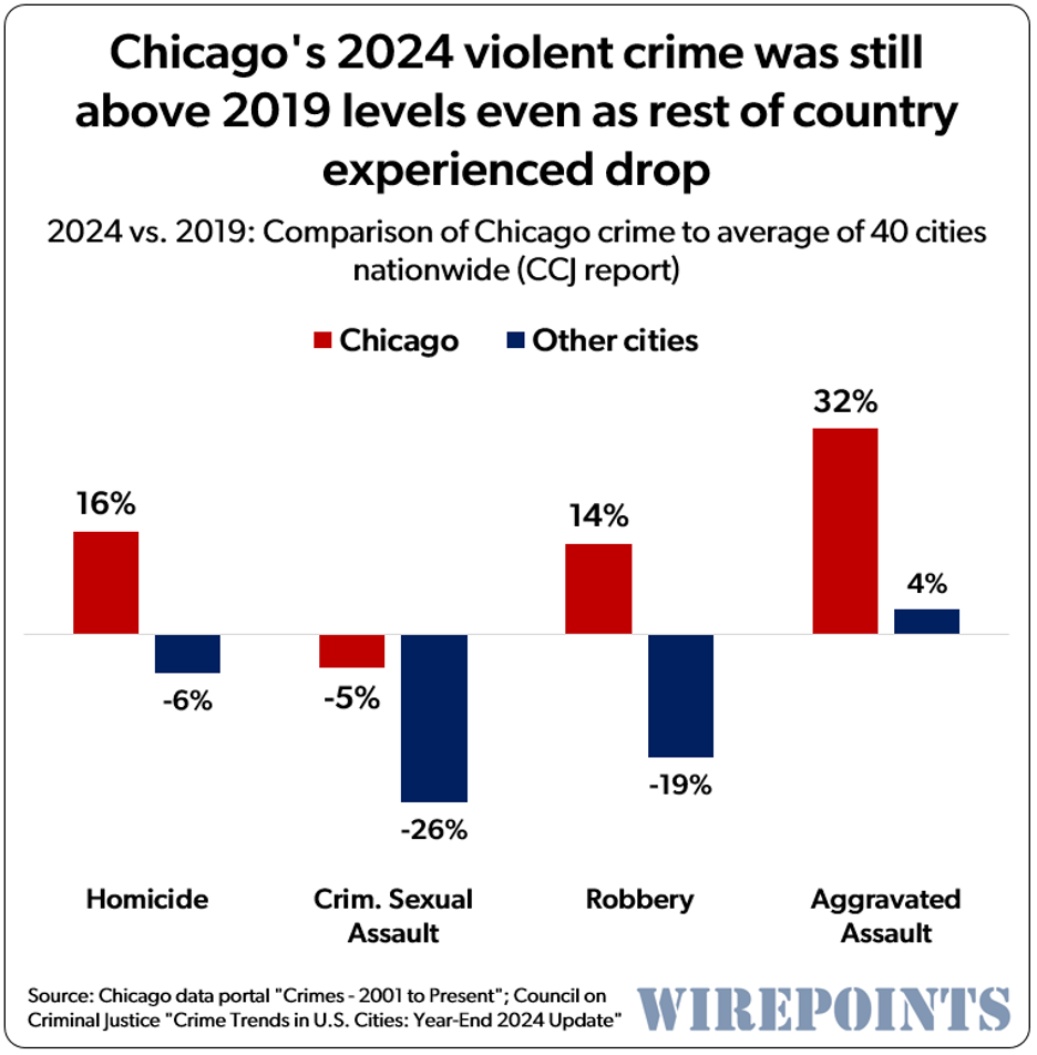 Again, Johnson is not wrong about a decrease in crime in Chicago. Decreasing crime rates are a trend nationwide. It is a trend that Chicago lags behind in, though, as Wirepoints pointed out in this article from last month. This Wirepoints’ chart shows that, compared to other cities, Chicago crime may be down, but not by the same percentage drop in other cities.