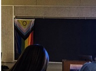 And the American flag in Hickman’s class is in the back of the room, unnoticed by students during class, who instead can’t help but look at the Progressive Pride Intersex flag instead.